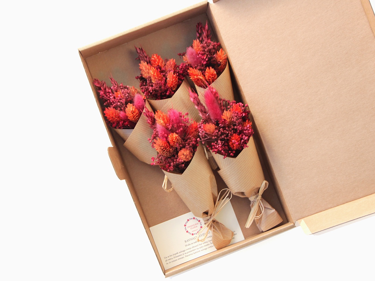 Če pošiljaš šopek suhega cvetja na drug naslov, lahko v paketek priložimo kartico s sporočilom in nanjo napišemo tekst, ki nam ga ob oddaji naročila v spletni trgovini pripiši v komentar. Kartico lahko izbereš in dodaš v košarico v meniju PAPETERIJA.