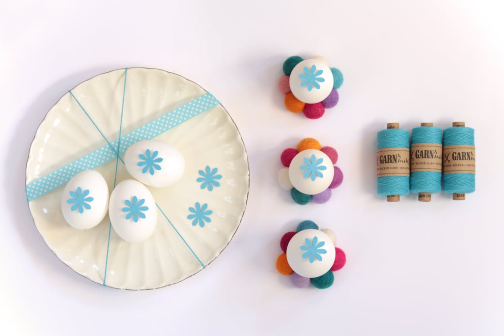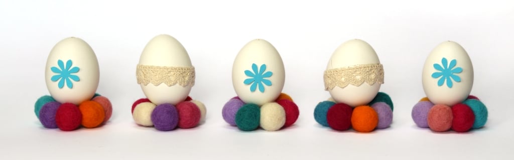 Kroglice iz filca so odličen material za ustvarjanje. 7 kroglic, premera 2 cm nanizaj na žico, nato oblikuj krog in oba konca žice poveži, tako, da nista preveč vidna. Nanjo postavi pirh in že imaš čudovito stojalce za pirhe. Jajčka je mogoče z bombažno dekorativno vrvico tudi oviti na različne načine in tvoja pomladna dekoracija je pripravljena.