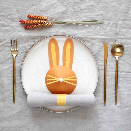 Za popestritev prazničnega pogrinjka lahko v hipu iz washi trakov in papirja izdelaš velikonočnega zajčka in obroč za serviete in z njim okrasiš krožnik.
